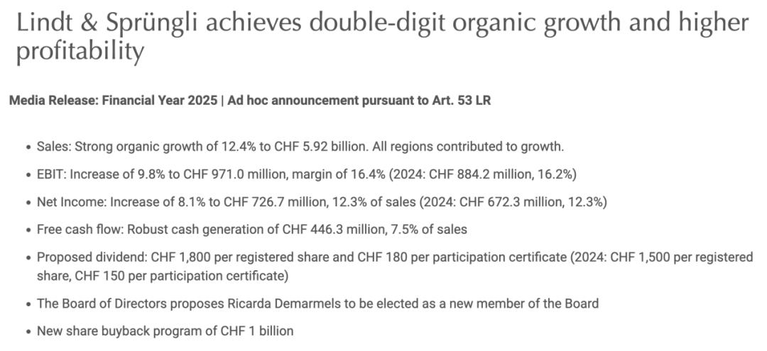 近日,瑞士莲(Lindt&Sprüngli)交出了一份利润创纪录的2025年财报。息税前利润(EBIT)同比增长9.8%,达到9.71亿瑞士法郎(约合人民币79.6亿元);全年销售额达到59.2亿瑞士法郎(约合人民币485.4亿元),实现了12.4%的有机增长。