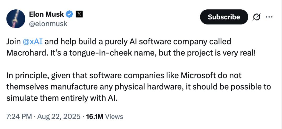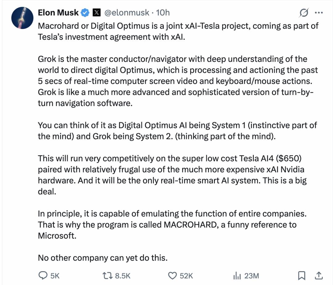刚刚,马斯克在X上宣布了一项“新”的AI项目:数字擎天柱(Digital Optimus)/巨硬(Macrohard)。