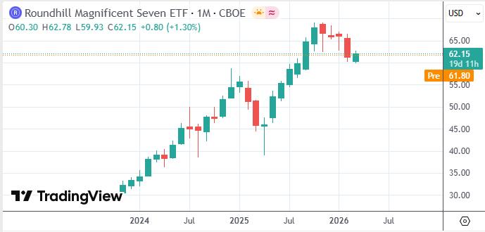 在中东冲突爆发之前,由于巨额资本支出令市场感到不安,投资者还担心AI工具将颠覆软件行业,这些超大市值的科技公司一度失宠,Roundhill Magnificent Seven ETF(MAGS)2月份累跌7.1%。