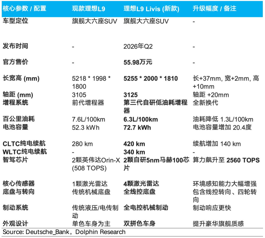 ① 自研算力底座即将落地: 采用 5nm 制程的自研“马赫 100(M100)”芯片即将量产落地,其单车双芯配置的有效算力高达 2560 TOPS 。该芯片将首搭于新一代旗舰 L9 Livis 车型 ,并计划在 2026 年推动 VLA 大模型的全系标配。