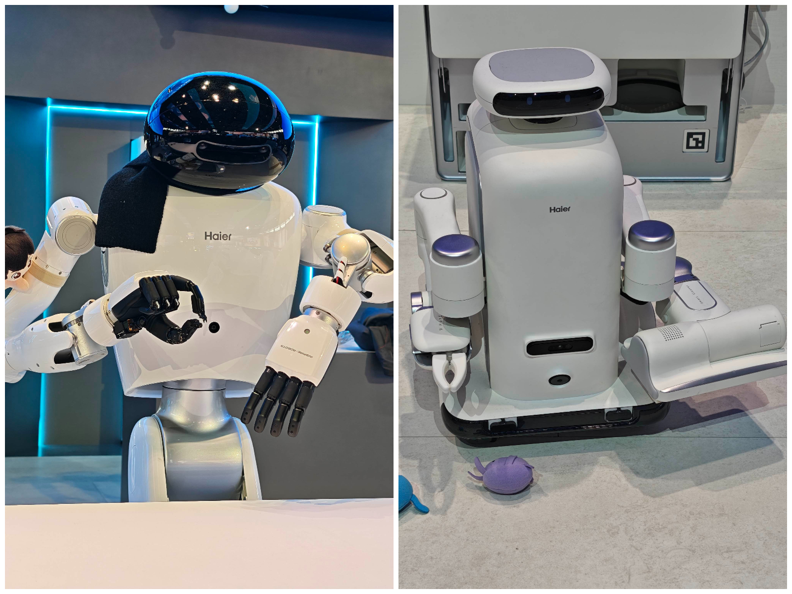 类似的思路也出现在海尔展馆。在这届海尔馆的机器人展区,海尔展示了三款机器人,移动陪伴机器人可以说的不多,这里略过不谈。关键在于另外两款,一款同样采用移动底盘设计的机器人,功能上支持食材分拣、剥香蕉、叠衣等功能;另一款则通过一手夹子、一手吸头重新设计了「扫地机器人」的形态。