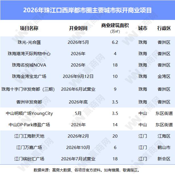 据赢商大数据不完全统计,2026年珠海、中山、江门共有11个商业项目开业,将为珠江口西岸都市圈带来超111万㎡商业供应。(文末附2026年珠海、中山、江门筹开集中式商业项目盘点清单)