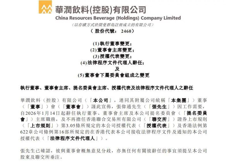 不过,1月14日公告中,华润饮料明确,李树清自当日起获委任为授权代表。