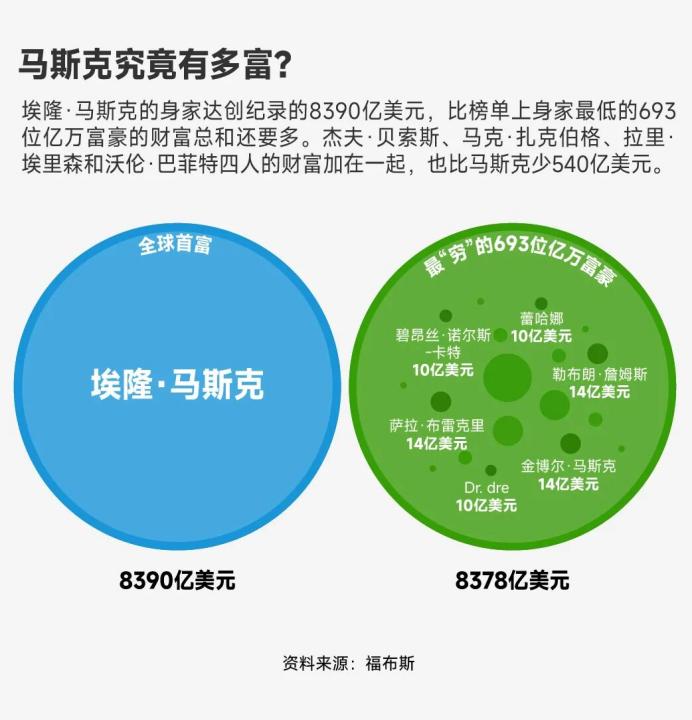 这一数字的震撼力,需要用最直观的对比才能体现。福布斯榜单数据显示,马斯克的8390亿美元身家,比榜单上身家最低的693位亿万富豪的财富总和还要多。