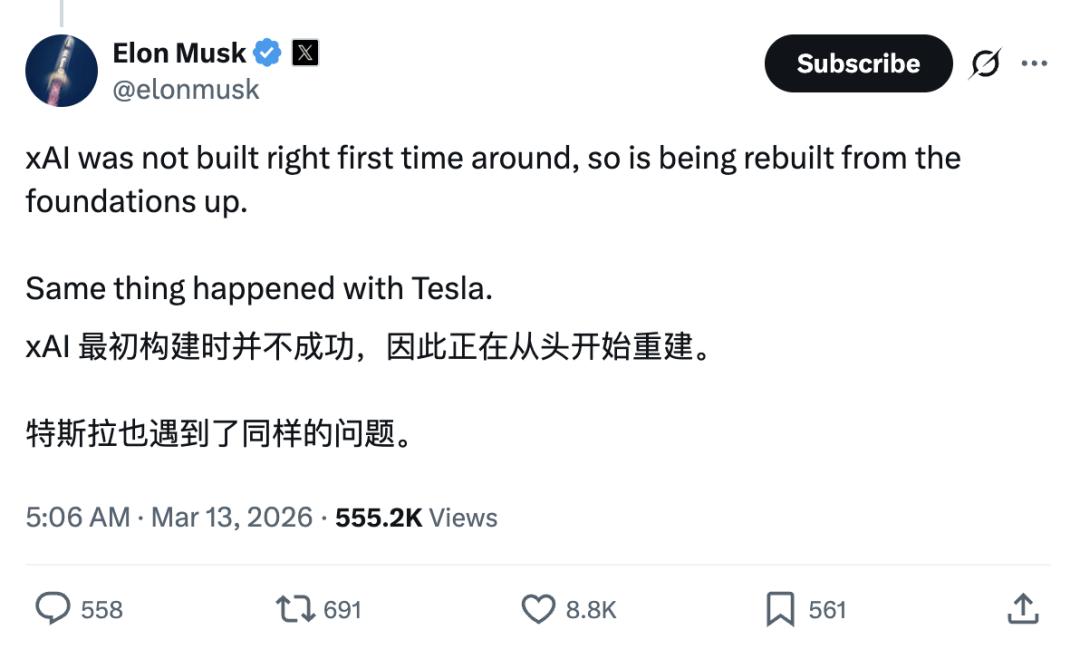 与此同时,老马也回应了xAI最近的一系列“提桶跑路”,还是地图炮:
