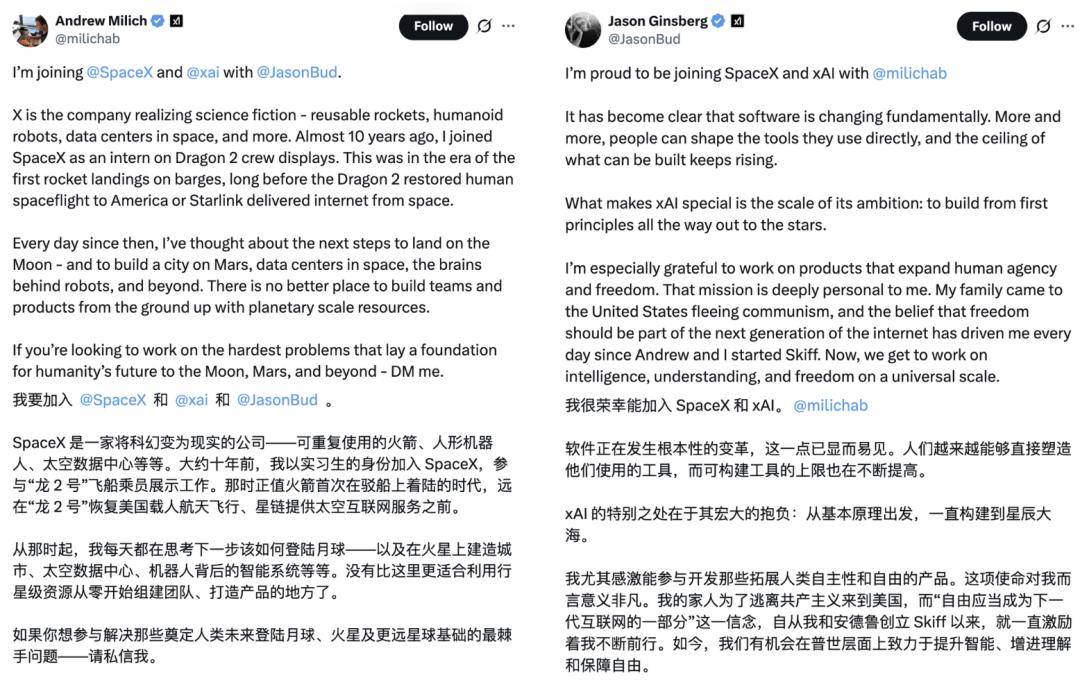 官宣推文上,Milich和Ginsberg解释了各自加入SpaceX和xAI的原因。