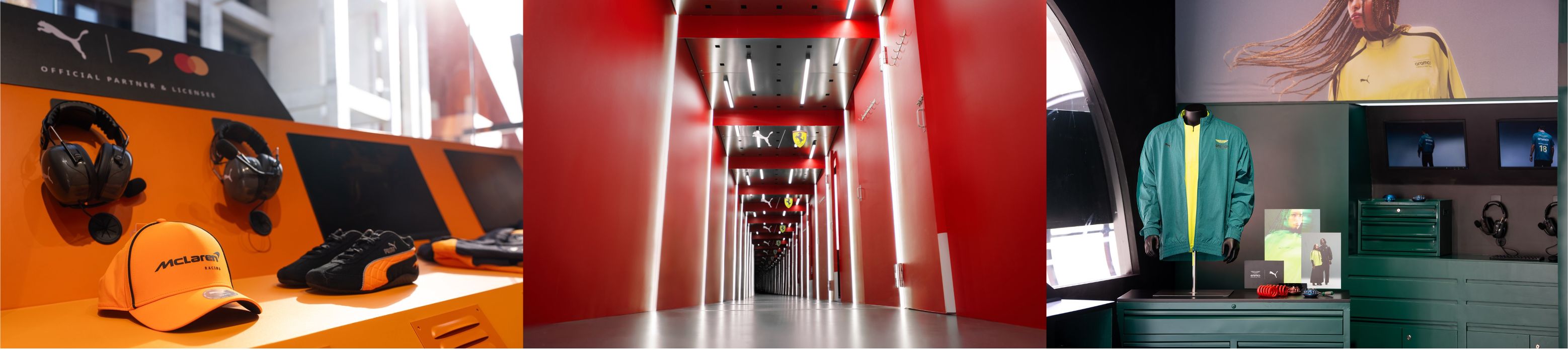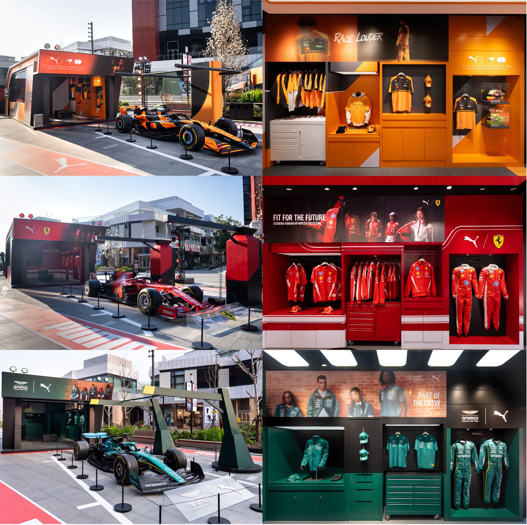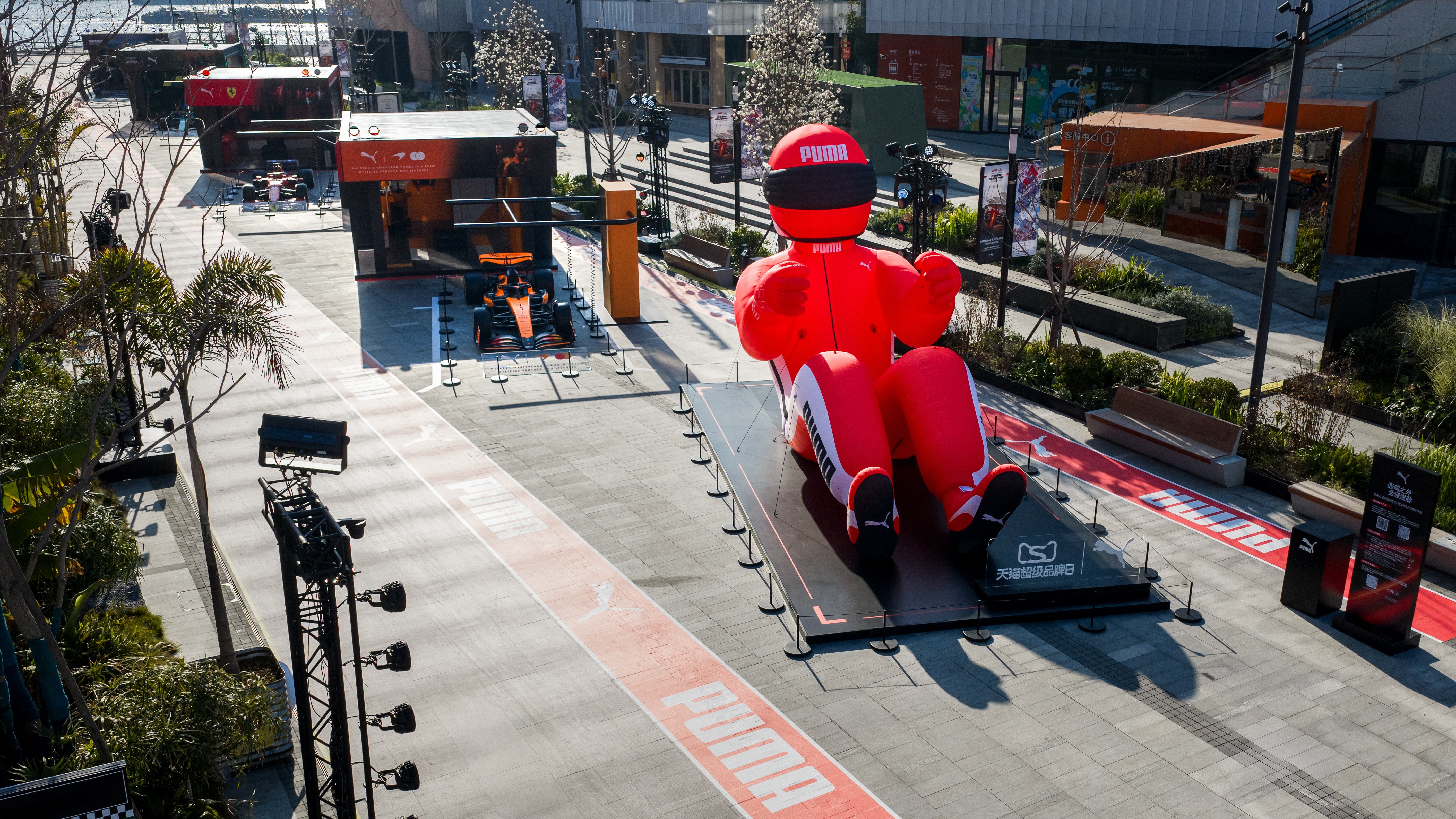 快闪空间整体以 F1 赛事核心场景为蓝本,高度还原McLaren Mastercard F1 Team、法拉利惠普F1车队、阿斯顿·马丁沙特阿美F1车队的赛车及P房实景,并延伸出PUMA NITRO科技空间与 Lifestyle 潮流空间,呈现出PUMA独一无二的先锋品牌文化。一条象征速度与激情的跑道贯穿全场,巧妙串联起各区域,营造出兼具专业竞技氛围与时尚张力的沉浸式聚场。