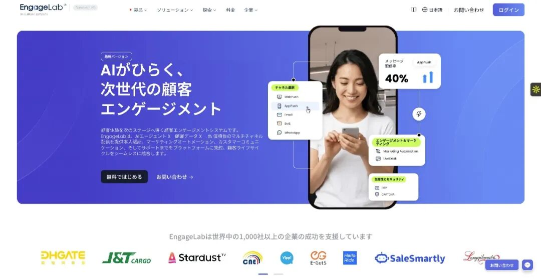 基于对日本市场的深度观察,我们决定以 EngageLab 这一统一品牌正式深耕本地市场。作为全球领先的 AI 原生客户互动平台,EngageLab 致力于为日本企业提供贯通全生命周期的平台底座:在统一的客户全生命周期数据之上,整合全渠道沟通 (Channels)、客户验证 (Verify)、营销自动化 (MA) 以及 AI 智能体 (AI Agent) 能力。