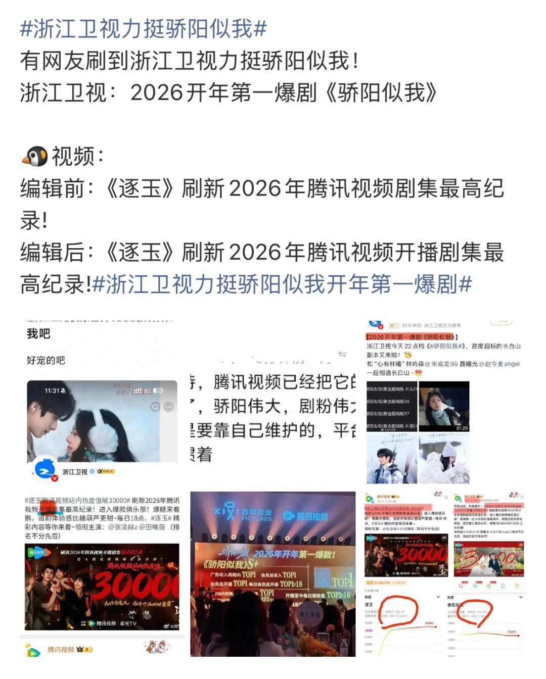 要知道,就在两个月以前(1月4日),《骄阳似我》刚刚以30130的站内热度刷新腾讯视频纪录,被官方认定为“2026开年第一爆款”。而随着《逐玉》热度持续走高,3月12日,腾讯视频将战报措辞悄悄从“刷新2026年剧集最高纪录”调整为“刷新2026年开播剧集最高纪录”,默认2025年年末播出的《骄阳似我》不计入榜单。这场关于“开播时间”的界定,让“年度剧集”的归属更加微妙。