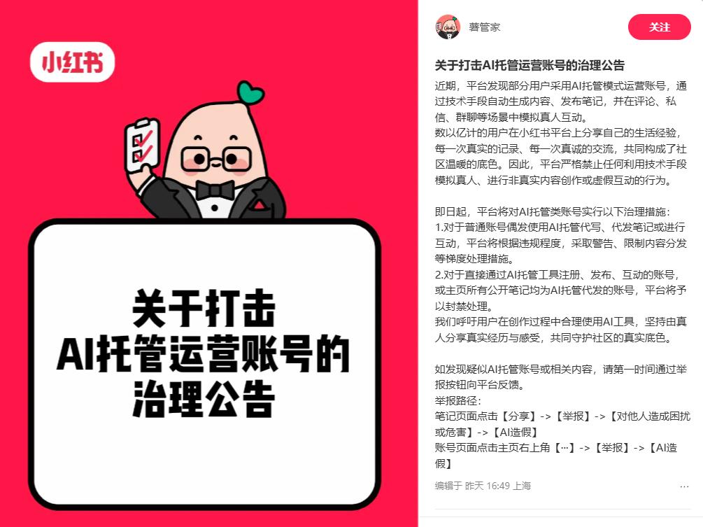且为了防止面对AI生成内容的泛滥,内容平台也开始了反击。小红书于3月10日发布紧急公告,宣布即日起封禁主页所有公开笔记均为AI托管代发的账号。