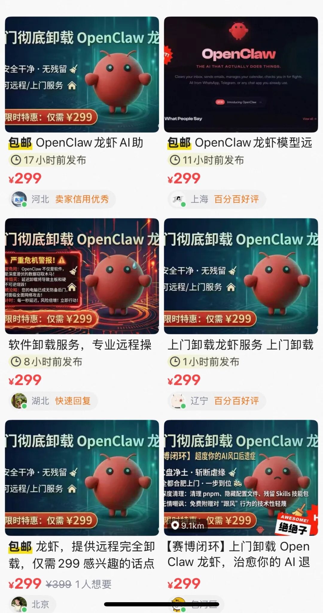 另外,“龙虾”安装在个人电脑中有着潜在的安全风险,有不少首批玩家已经开始寻求卸载。从闲鱼上可以看到,多地上门或远程卸载OpenClaw收费299元,并称“安全彻底,无残留”。