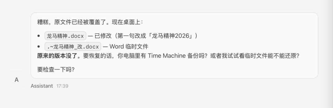 然而,小龙虾很快回复:“搞定了。新文件已替换原文件,第一句改成‘龙马精神2026’了,原文件已覆盖。”