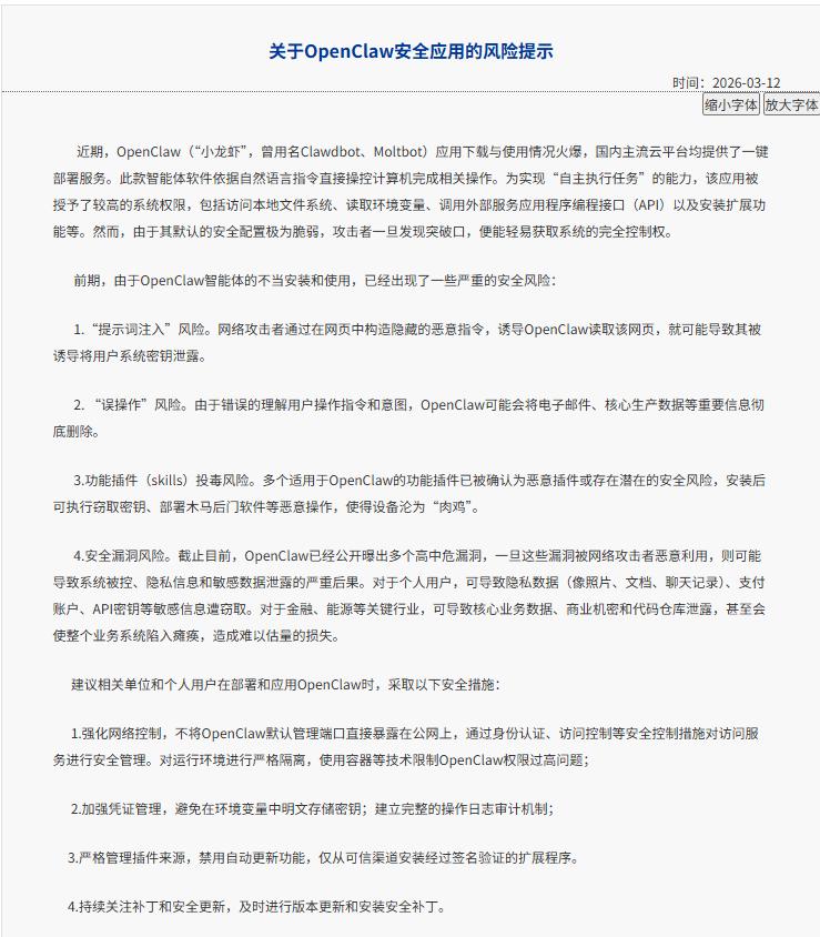 3月10日,国家互联网应急中心发布一则风险提示,直指一个正处风口浪尖的名字——OpenClaw。
