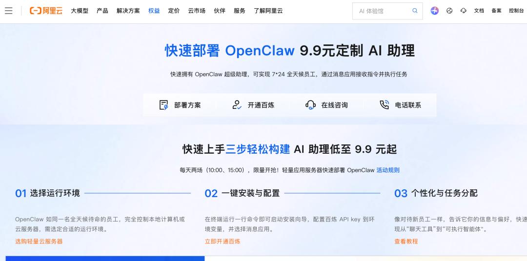 在阿里云官网,“快速部署 OpenClaw 9.9元定制 AI 助理”“5分钟快速部署 CoPaw”的广告醒目,还配有手把手的图文教程。