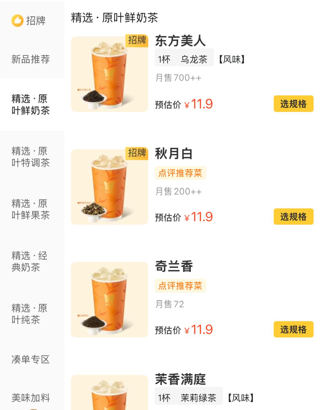 不同于以前尝试的无人自助奶茶店、快闪店,香飘飘在杭州开出的奶茶店主打原叶鲜泡茶,产品涵盖原叶鲜奶茶、原叶特调茶、原叶鲜果茶、经典奶茶、原叶纯茶等系列,一杯的定价介于5.9元到16元之间,人均消费在10元上下。