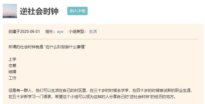 豆瓣“逆社会时钟”小组,聚集了超过9万名成员,他们在上面分享着“30岁从央企裸辞旅居,开启第二人生”“48岁妈妈参加成人高考读药学”“50岁出国留学”等个人故事,试图打破“什么年龄该做什么事”的社会规训。