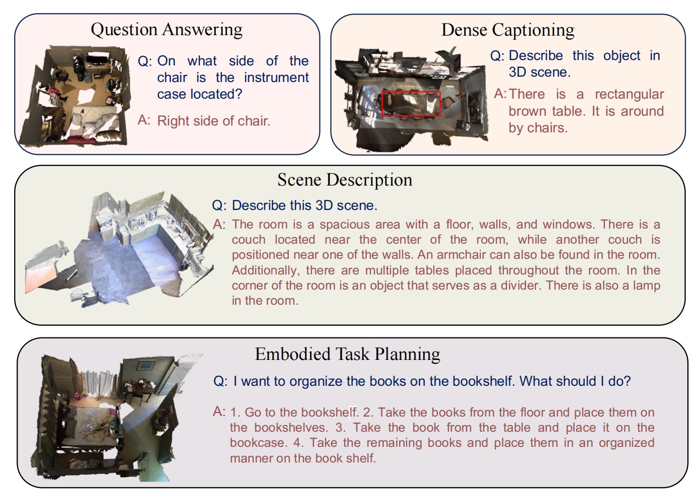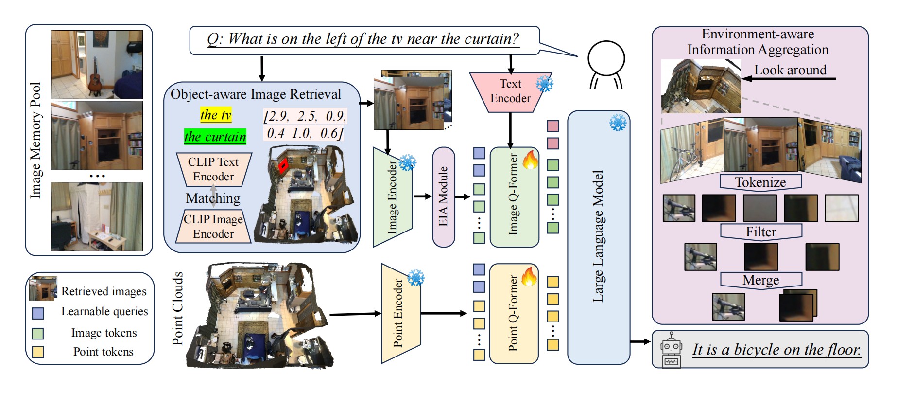 从人类“环视四周”和“过滤无用信息”的行为特征中汲取灵感,研究进一步引入环境感知信息聚合(EIA)模块,用于收集周边环境信息,以获取更多任务相关内容。具体而言,该模块由信息获取与信息聚合两个部分构成,分别旨在获取周边区域信息,以及对获取的信息进行过滤与融合。最终,将收集到的信息与指令输入大语言模型,得到方案解答。实验结果表明,该方法能有效利用点云和任务相关图像的信息,在3D视觉问答和3D密集描述等多项任务中实现性能提升。
