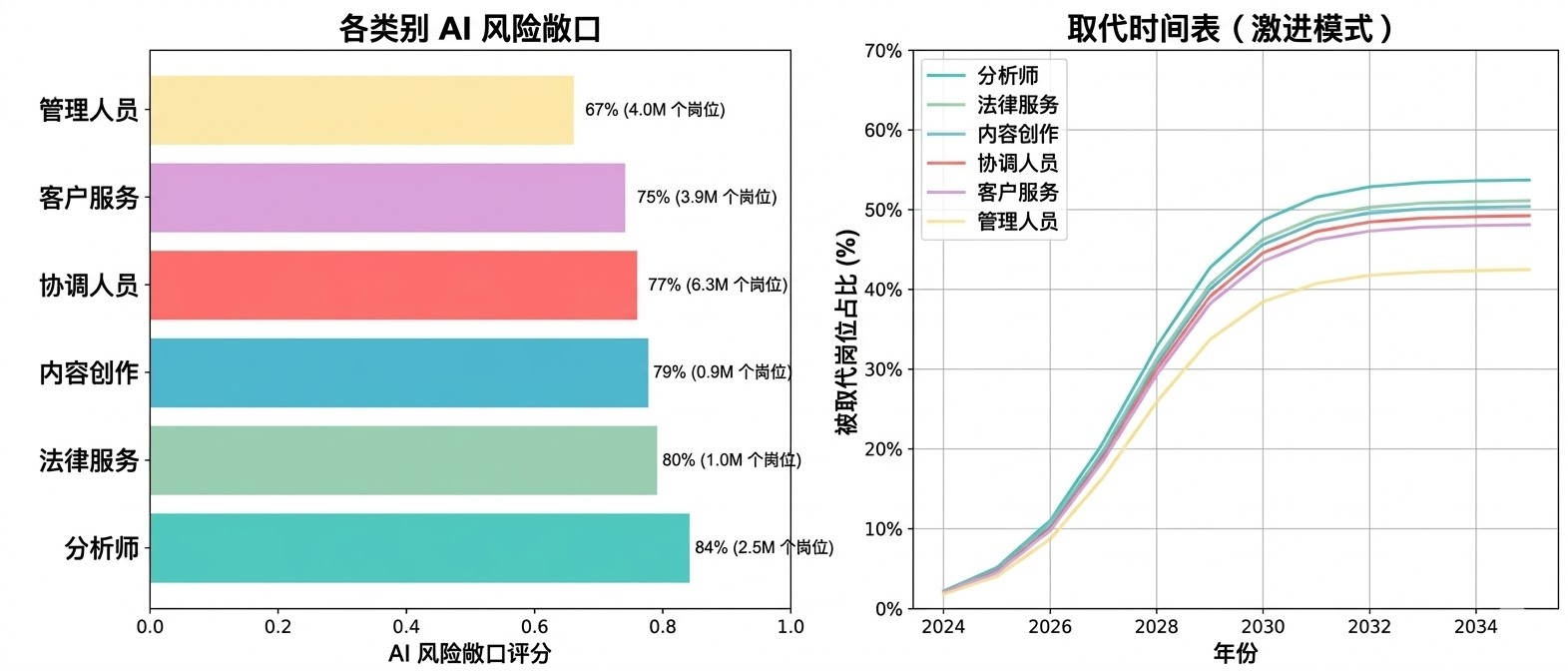 这一次,取代的速度更快(5-7年而非20年),规模更大(810万对比500万),而且退路——服务性工作——本身也在自动化。当AI也在处理客户支持、数据录入和内容创作时,一个被AI取代的项目经理能去哪里?