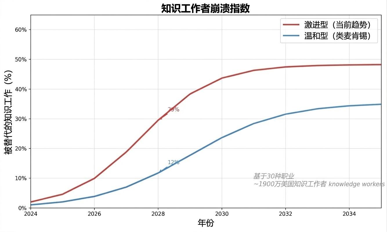 两条曲线之间的差距正在迅速缩小。十二个月前,温和情境看起来还很现实。但今天,随着Claude能编写高达100%的生产代码、AI智能体大规模处理客户支持,以及自动化分析取代初级分析师团队——激进曲线才更符合现实。