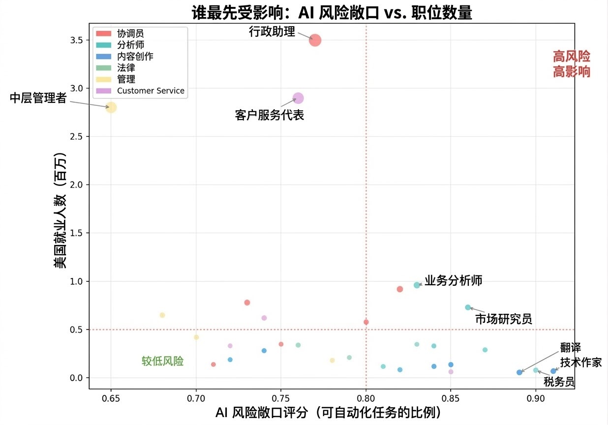 这是让我彻夜难眠的一张图。X轴是暴露得分。Y轴是该类别的总就业人数。右上象限是“杀戮区”——高暴露、高数量。