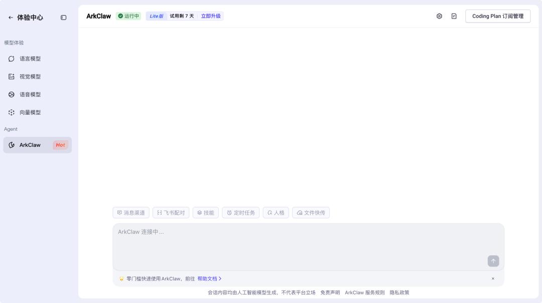 ArkClaw 创建后的主界面|图片来源:ArkClaw
