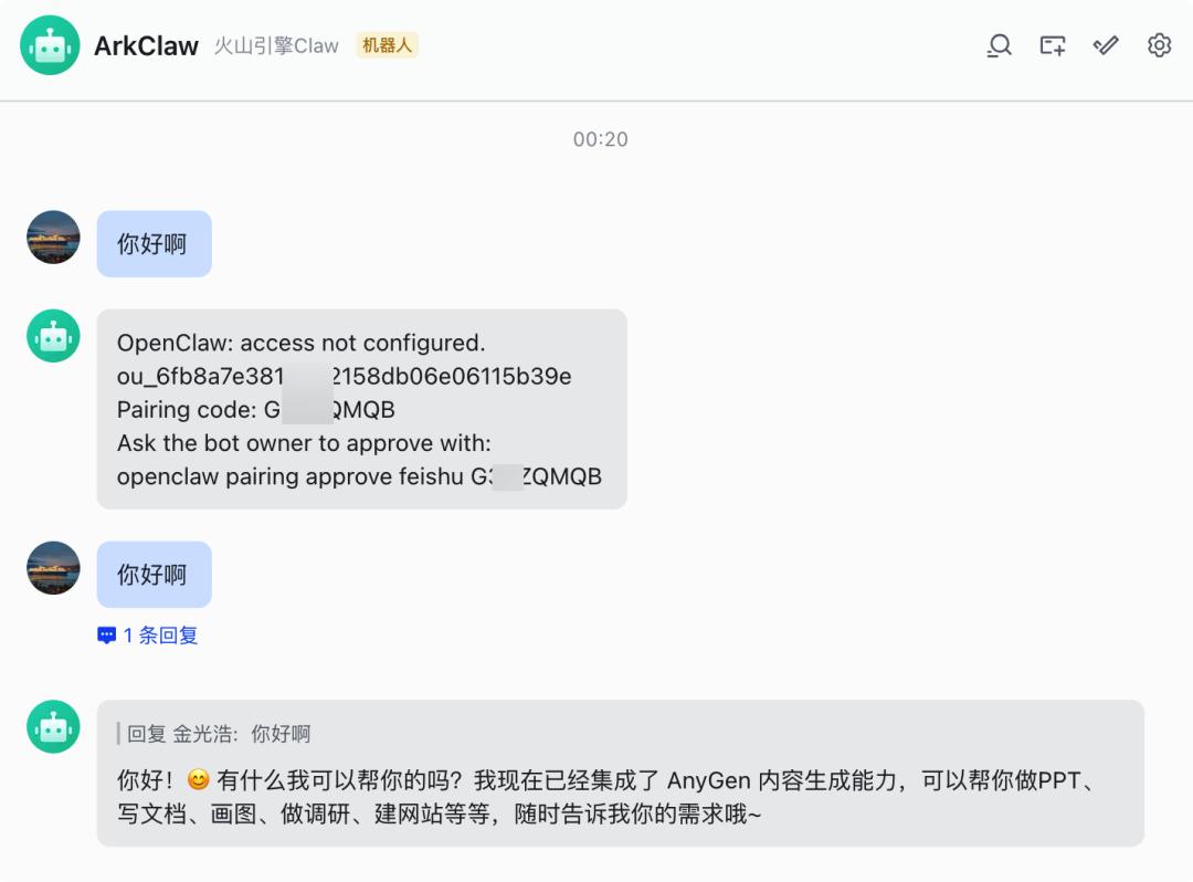 更新后,此时在飞书机器人里发一个消息,飞书机器人会返回一个 Pairing code,把这个 code 给到 ArkClaw,整个配置就完成了。