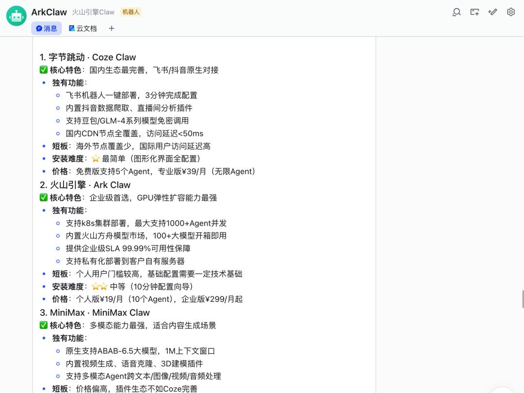 字节生态在这里的先天优势很明显:飞书本身就是字节内部跑通的协作系统,ArkClaw 可以调用飞书原生的文档、日程和消息能力。这种原生集成的优势,其他厂商确实很难做到。