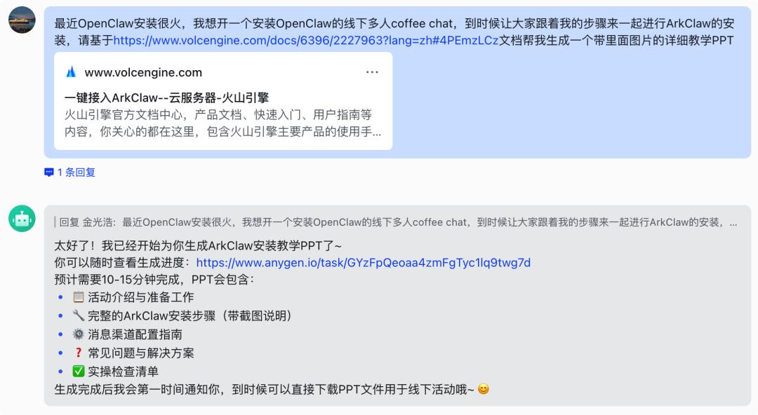 最近安装 OpenClaw 业务火,我们在线下分享的 coffee chat 的 PPT 就可以教给 ArkClaw。