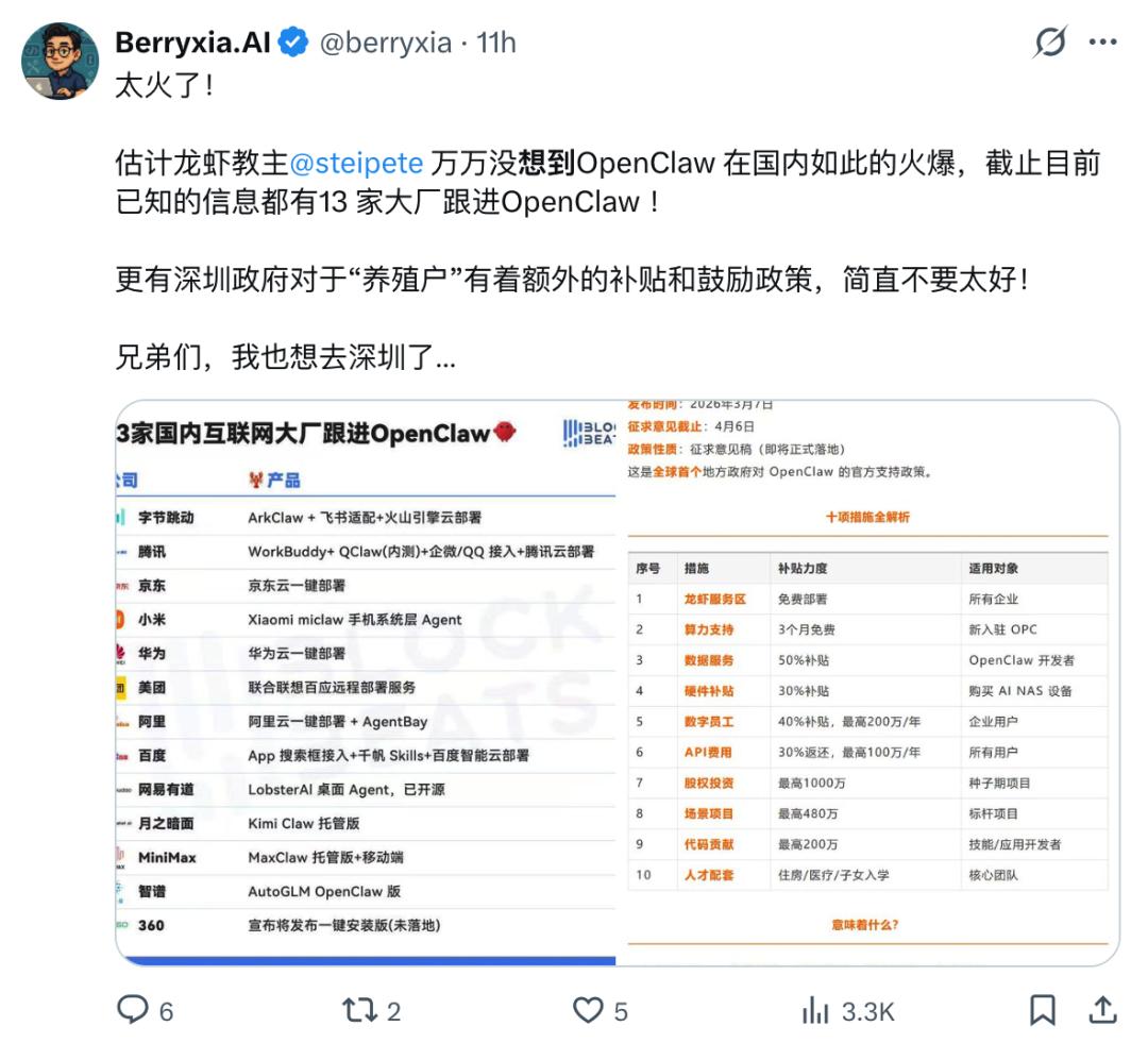 13 家互联网大厂跟进 OpenClaw|图片来源:X