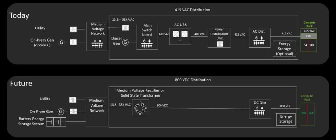 英伟达从415伏交流(上)到800伏直流(下)的配电架构演进(图源/企业)