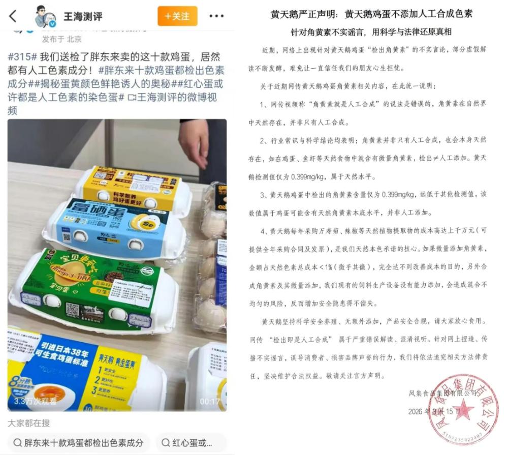 为佐证自身立场,黄天鹅在声明中披露了更多细节,包括品牌每年投入超千万元采购万寿菊、辣椒红等天然色素原料,相关采购合同与发票均可作为凭证;人工添加角黄素在成本投入上得不偿失,且现有饲料生产设备不具备微量添加合成角黄素的技术条件,强行添加反而会造成混合不均的安全隐患。品牌也明确表示,网传“检出即等于人工合成”属于恶意混淆概念,已正式启动法律程序,追究相关主体损害品牌声誉的责任。