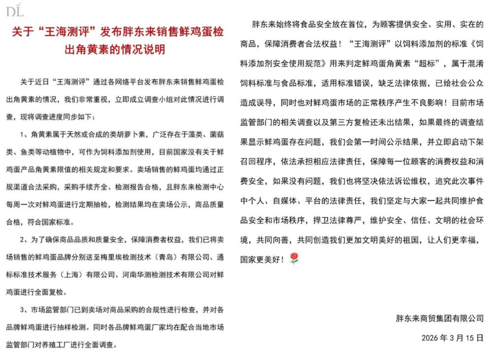 胖东来同时指出,王海团队以饲料添加剂的标准判定鲜鸡蛋角黄素超标,属于混淆饲料标准与食品标准,适用标准错误且缺乏法律依据,已对市场正常秩序造成不良影响。