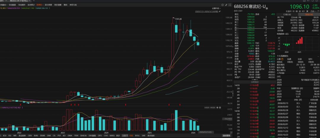截至2026年3月13日,寒武纪股价为1096.1元,较2025年8月高点已经下跌超过30%。