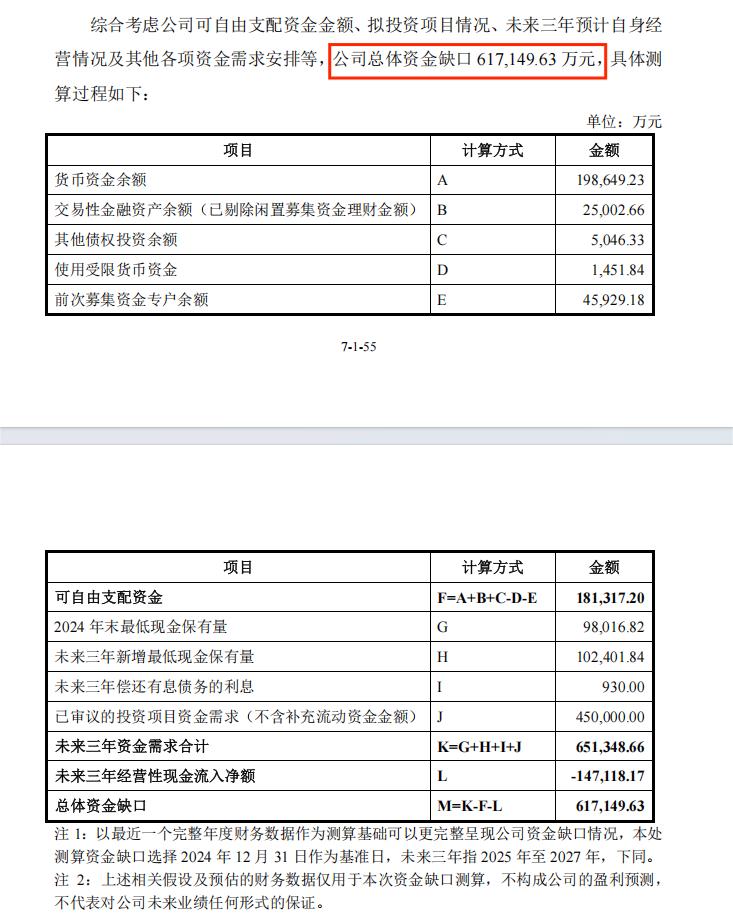 2025年7月,在回复监管问询时,寒武纪明确表示:综合考虑公司可自由支配资金金额、拟投资项目情况、未来三年预计自身经营情况及其他各项资金需求安排等,公司总体资金缺口61.7亿元。