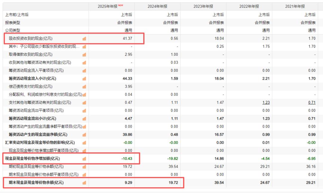 哪怕寒武纪在2025年吸引投资收到的现金高达41.37亿元,但最终“现金及现金等价物净额”依然减少了超过10亿元,由2024年末的19.72亿元减少至2025年末的9.29亿元。