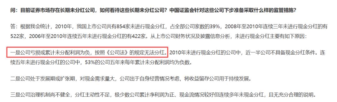 但问题在于,分红从来不是一句话就能决定的事。证监会此前对记者问答时也说过:“公司亏损或累计未分配利润为负无法分红”。