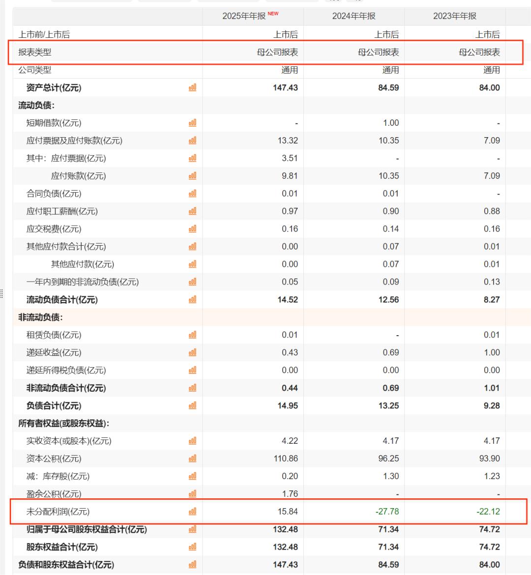 到2025年末,寒武纪母公司报表中的未分配利润突然变成15.84亿元。这并不是盈利自然积累的结果,而是来自一次关键的会计处理。