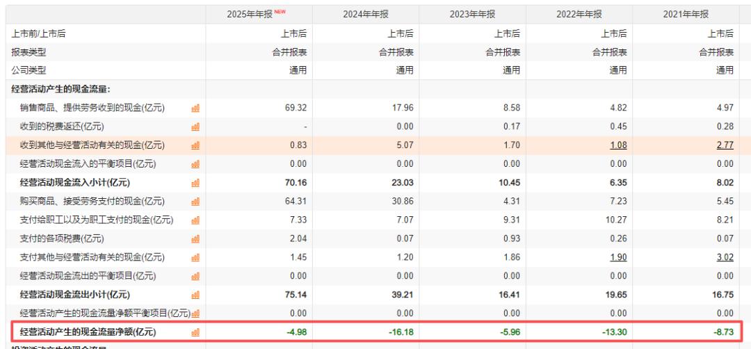 2021-2025年,其寒武纪营现金流净额分别为-8.73亿元、-13.3亿元、-5.96亿元、-16.18亿元和-4.98亿元,净流出合计接近50亿元。