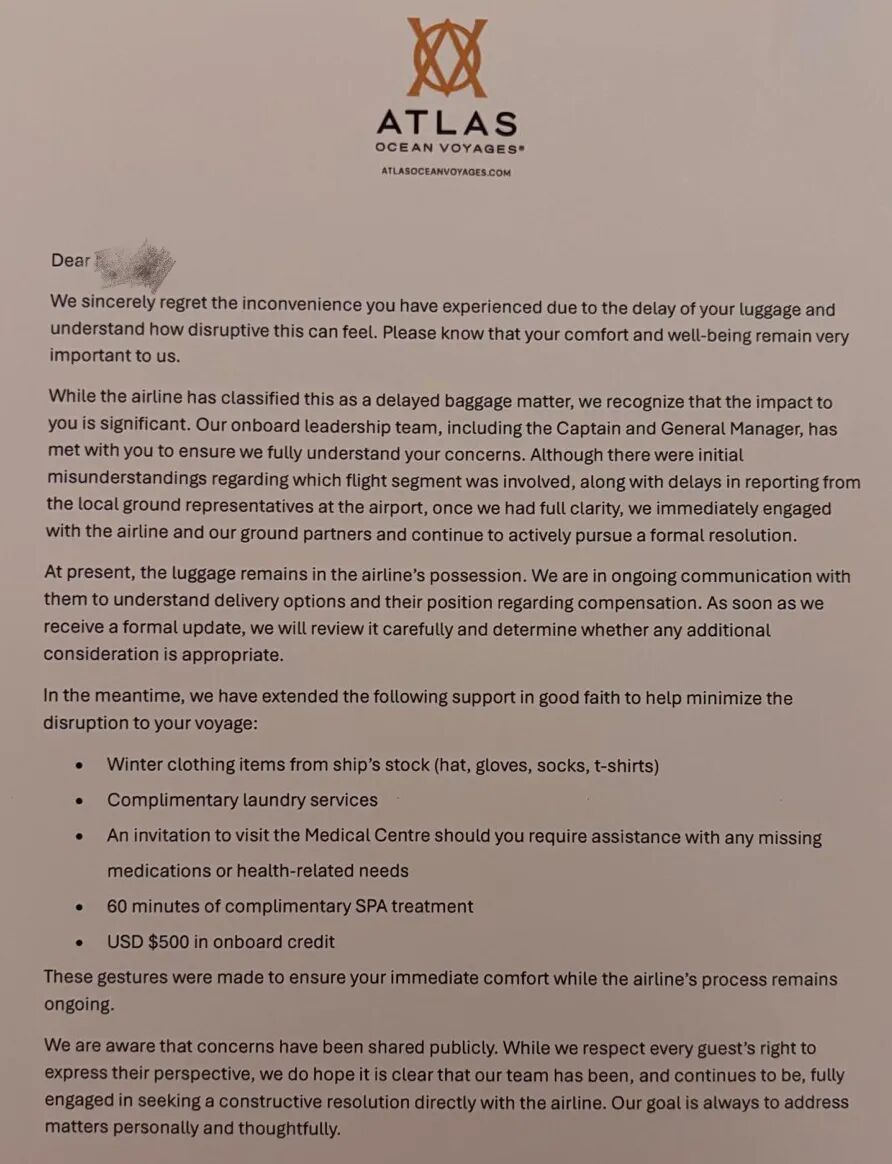 “我们乘坐单程超过30小时的飞机,努力攒下旅费才来到这个地球上距离中国最远的地方,这可能是一生一次的体验,却因为「五星豪华」邮轮公司Atlas的服务,度过了人生中最愤怒的一个春节。”