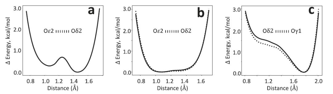 在 YajL 蛋白中,两处 E14/D23 短氢键的 AQuaRef 精修结果同样与无约束精修一致,表明质子由 D23 与 E14 共同共享,呈现典型的低势垒氢键特征。这一情况与 DJ-1 中质子主要定位于单个氧原子的情形不同。AIMNet2 给出的能量分布呈现较为平坦的势能面,意味着质子位置可以在实验数据的约束下自由调整。同时,差值电子密度图在氢原子附近均出现显著高于 3σ 的峰值,为这一结构解释提供了进一步证据。