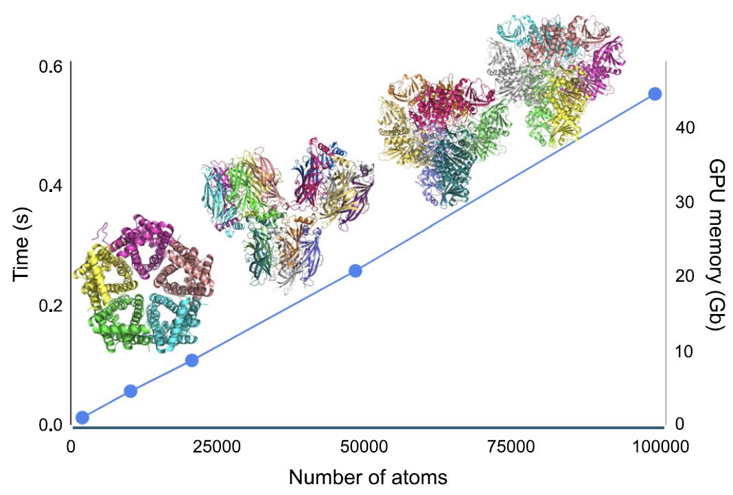 在计算效率方面,如下图所示,AIMNet2 框架中能量和原子力的计算时间以及 GPU 峰值显存占用均与体系原子数呈线性(O(N))增长。对于包含约 10 万个原子的蛋白质体系,单点能量和力计算仅需约 0.5 秒;在单块配备 80GB 显存的 NVIDIA H100 GPU 上,最多可处理约 18 万个原子的模型。