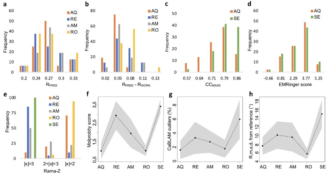 AQuaRef、Servalcat(SE)、REFMAC5(RE)、AMBER(AM)和 Rosetta 对 61 个低分辨率模型的优化结果
