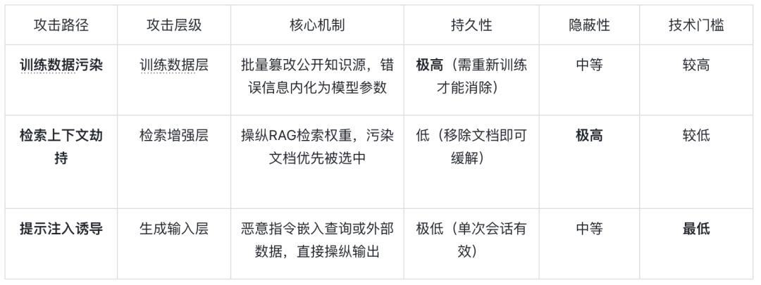 第一种:训练数据污染——这是针对AI训练数据层的攻击,通过批量篡改公开知识源,植入错误信息。