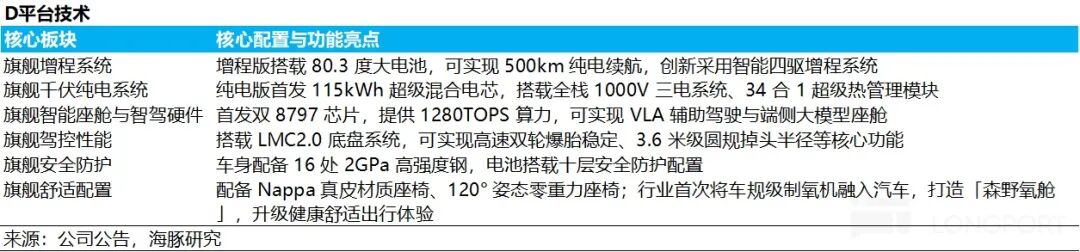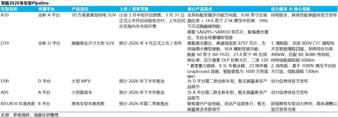a. 定位更高端的 D 系列(20 万级以上车型):该平台是零跑实现品牌定位上攻与车型结构升级的关键,将搭载六大核心技术:如增程版采用大电池、1000V 高压平台、1280TOPS 高算力智驾芯片等。而基于此平台的首款车型 “D19” 全尺寸 SUV 将于 2026 年 4 月上市,后续还将推出 “D99” 大型 MPV。