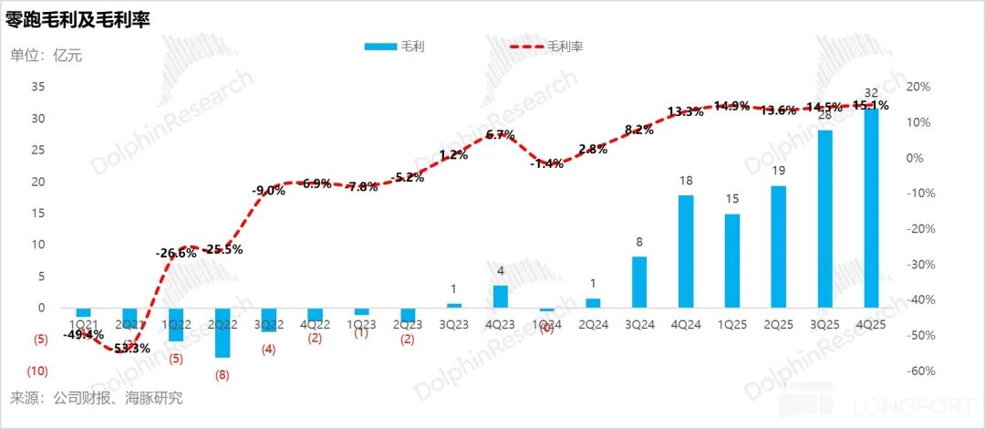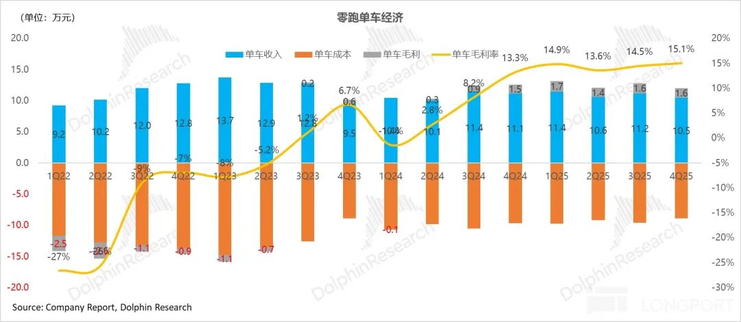而本季度实际零跑的毛利率 15%,环比略有上行 0.5 个百分点,略高于管理层指引,主要仍然因为公司持续的强降本能力,以及四季度由于出海销量的高增,带来的高毛利的碳积分收入的确认也在增加(Q4 预计 5 亿 + VS Q3 2.5 亿)。