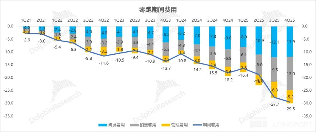 零跑四季度销售费用达 13.0 亿元,不仅大幅超出市场普遍预期的 10.3 亿元,环比第三季度也显著增加 3.5 亿元。费用的超预期增长,主要源于公司为支撑 2026 年激进的全球销量目标,而同步进行的国内渠道下沉扩张、海外网络布局以及品牌营销投入。