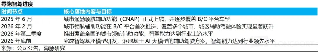 c. 智能化上,零跑坚定投入端到端大模型技术路线,并布局 VLA(视觉 - 语言 - 动作)等前沿方向。零跑之前计划在 2025 年底前实现基于端到端的城市 NOA(组合辅助驾驶)能力,目前主力车型已做到城市记忆领航(车记住固定路线)与高速 NOA,仍然在智能化进度上处于努力追赶状态,零跑期望在 2026 年底前完成智驾基座模型研发,智驾能力达到行业领先水平。
