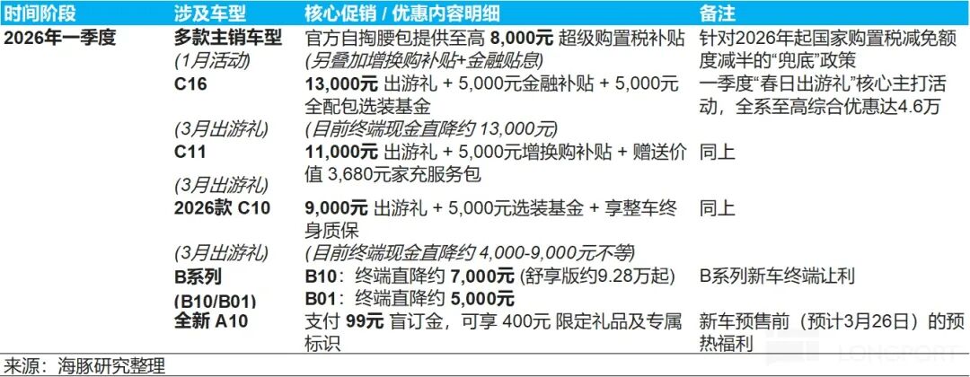此外,尽管以旧换新政策自 2026 年 1 月 1 日起生效,但地方政府补贴落地节奏不一(例如湖北省 1.15、吉林省 1.17 等),导致部分潜在消费者推迟购车计划。也因此,公司还加大了整体的促销力度,以及提供购置税兜底政策,为了提振一季度的销量。