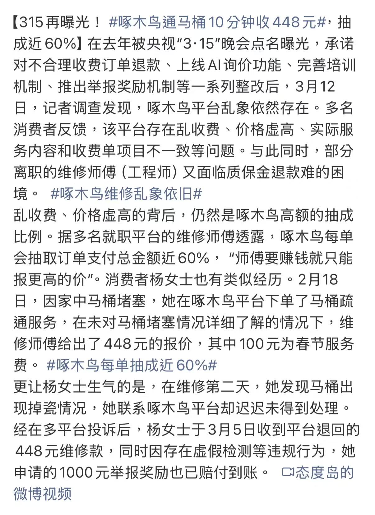 再比如说,广东一位用户的洗衣机出现无法排水的问题,通过维修平台预约服务后,维修人员表示排水泵已经损坏,需要更换整套排水系统,总费用接近 700 元。但几天后,另一位维修师傅检查发现,仅仅是排水口被硬币卡住,清理后机器即可正常使用。这些都是一些明明能够简单处理就解决的问题,却被包装成疑难杂症。