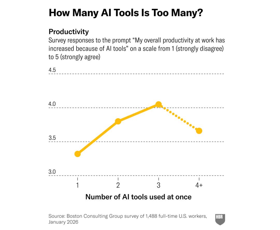 他们发现,当用户同时使用1到2个AI工具时,生产力会显著提升;到第三种时,生产力依旧会提升,但增速放缓;如果再持续增加一个,生产力反而会下降。